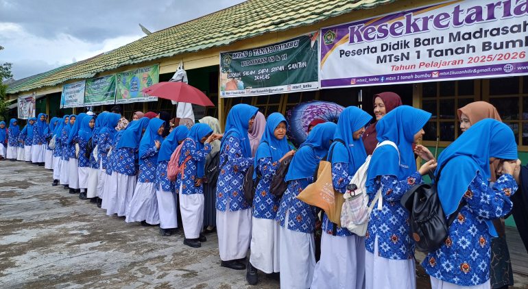 Kusan Hilir (MTsN 1 Tanbu) – Madrasah Tsanawiyah Negeri 1 Tanah Bumbu memulai hari pertama masuk madrasah setelah libur panjang Hari Raya Idul Fitri 1446 H. Masih dalam suasana lebaran, kesempatan tersebut digunakan seluruh warga MTsN 1 Tanbu untuk mengadakan kegiatan pembiasaan Rabu pagi, yakni sholat Dhuha berjamaah kemudian dilanjutkan dengan acara halal bi halal, bertempat di halaman madrasah, pada Rabu (9/4/2025).