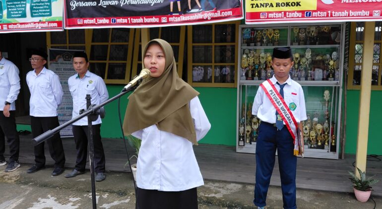 Kusan Hilir (MTsN 1 Tanbu) – Pembina upacara Asti Wulandari, S.Psi.I dalam amanatnya mengajak siswa-siswi Madrasah Tsanawiyah Negeri 1 Tanah Bumbu (MTsN 1 Tanbu) mengasah pentingnya kepekaan sosial dengan saling menjaga dan membantu menegakkan tata tertib madrasah, Senin (08/09/25).