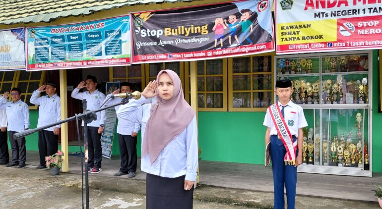 Kusan Hilir (MTsN 1 Tanbu) – Madrasah Tsanawiyah Negeri 1 Tanah Bumbu (MTsN 1 Tanbu) menggelar upacara bendera rutin pada Senin pagi. Upacara kali ini staf Tata Usaha (TU), Bahriah, yang bertindak sebagai pembina upacara, Senin (15/09/2025).