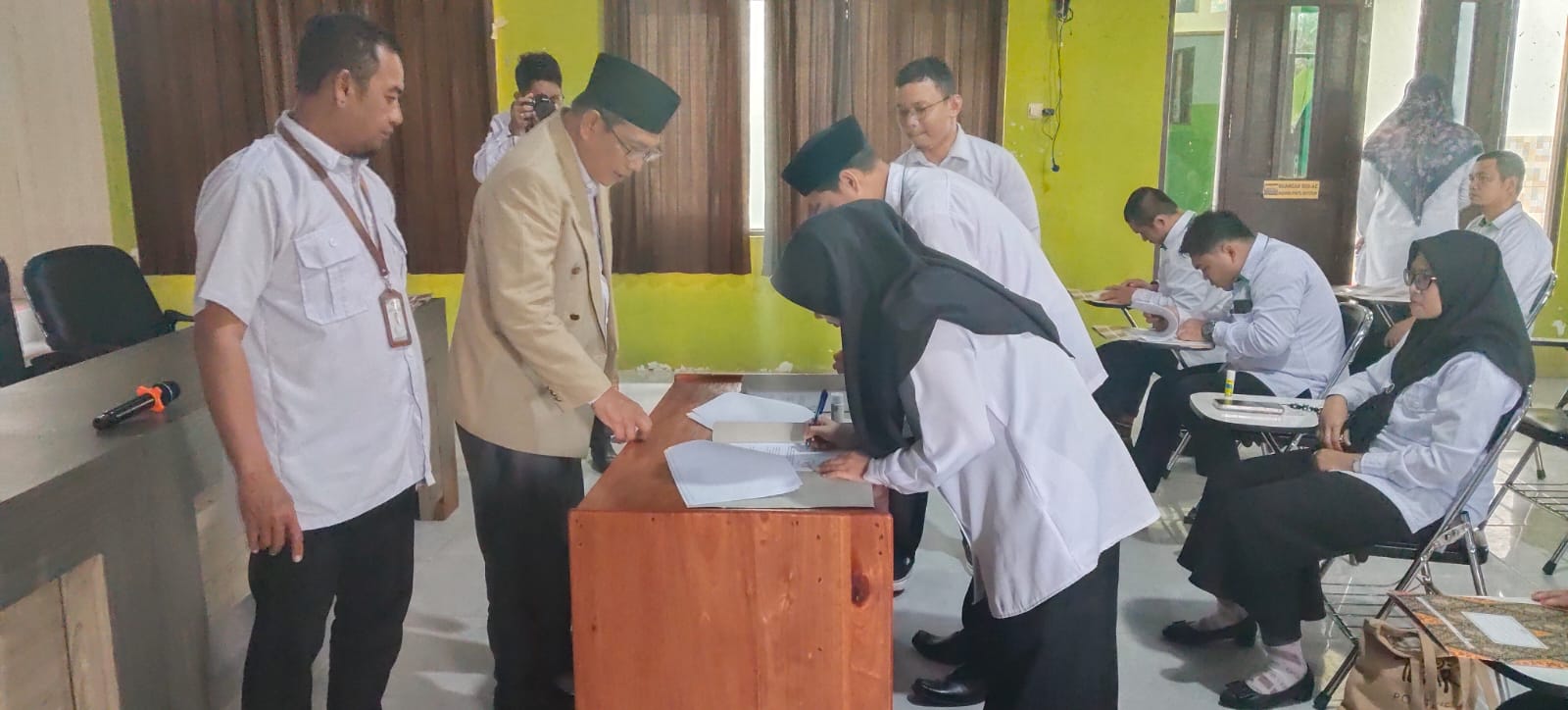 Kusan Hilir (MTsN 1 Tanbu) – Sebanyak 6 Pegawai Pemerintah dengan Perjanjian Kerja (PPPK) Tenaga Kependidikan Madrasah Tsanawiyah Negeri 1 Tanah Bumbu (MTsN 1 Tanbu) menghadiri acara penandatanganan kontrak kerja PPPK Tahap 1 tahun 2024. Kegiatan penting ini berlangsung di aula Kantor Kementerian Agama Kabupaten Tanah Bumbu (Kemenag Tanbu) pada Selasa (09/09/25).