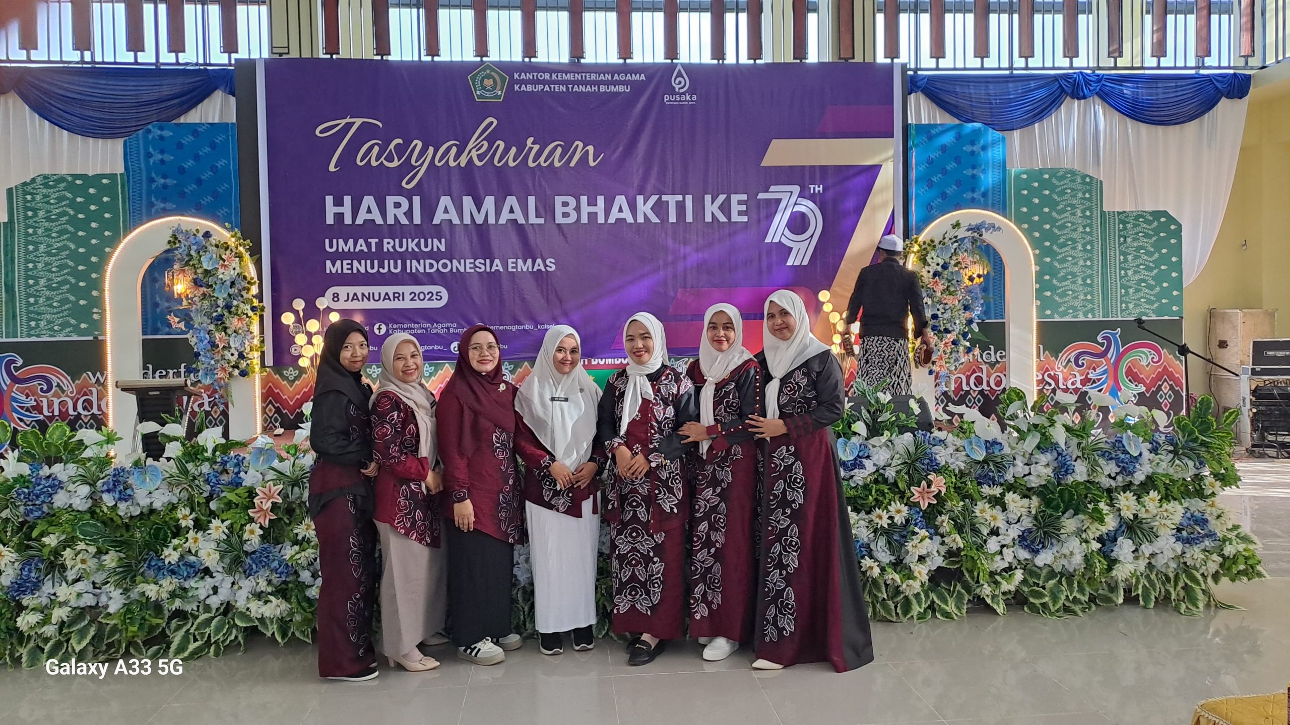 Kusan Hilir (MTsN 1 Tanbu) – Seluruh Aparatur Sipil Negara (ASN) Madrasah Tsanawiyah Negeri 1 Tanah Bumbu (MTsN 1 Tanbu) menghadiri tasyakuran Hari Amal Bhakti (HAB) Kementerian Agama (Kemenag) ke-79 dengan tema “Umat Rukun Menuju Indonesia Emas” di Gedung 7 Februari Kota Pagatan, Rabu (08/01/25).