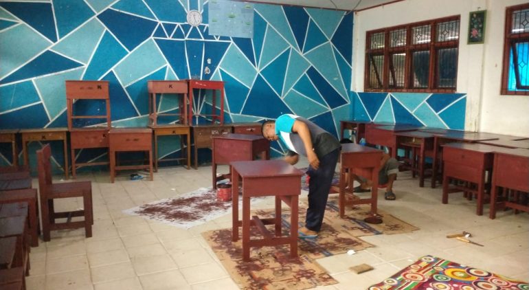 Kusan Hilir (MAN Tanbu) — Wakil Kepala Madrasah Bidang Sarana dan Prasarana MAN Tanah Bumbu, Ardy Agus Fryana, S.Pd, melakukan pemeliharaan terhadap seluruh meja dan kursi madrasah, Minggu (8/9/24).