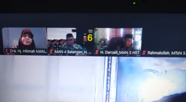 Kusan Hilir (MAN Tanbu) – Kepala Madrasah Aliyah Negeri (MAN) Tanah Bumbu, Dra. Hj. Hikmah, MM, bersama Wakil Kepala Madrasah (Wakamad) Bidang Kesiswaan, Suhirman, S.Pd, menghadiri Zoom Meeting terkait rapat persiapan dan teknis pelaksanaan Penerimaan Peserta Didik Baru (PPDB) serentak untuk Tahun Pelajaran 2025/2026, Rabu (5/2/25).