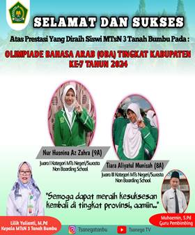 Satui (MTsN 3 Tanbu) – Dua orang peserta Olimpiade Bahasa Arab (OBA) ke-7 dari Madrasah Tsanawiyah Negeri 3 Tanah Bumbu berhasil menyabet gelar juara untuk penyelenggaran OBA tingkat Kabupaten Tanah Bumbu tahun 2024.