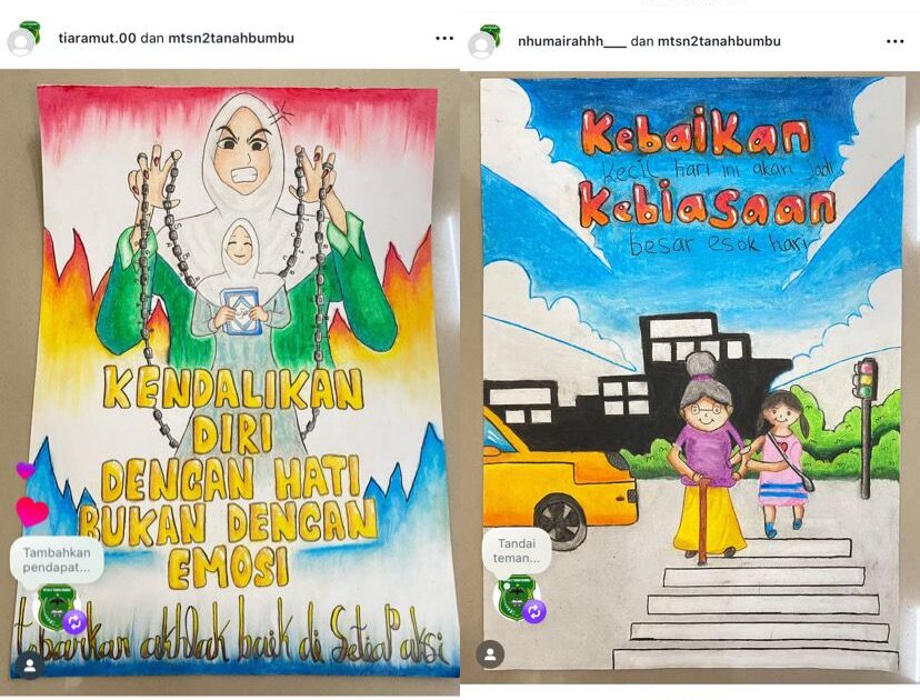 Kusan Hilir (MTsN 2 Tanbu) – Sebanyak empat siswa MTs Negeri 2 Tanah Bumbu, yaitu Nur Khumairah kelas 8B, Husaini kelas 8B, Ramji Norsi kelas 7, dan Mutiara Ramadani kelas 9 mengikuti Lomba Membuat Poster dalam rangka Lomba Literasi Keagamaan yang diselenggarakan secara online oleh Pusat Penilaian Buku Agama, Lektur, dan Literasi Keagamaan, Sekretariat Jenderal Kementerian Agama RI.