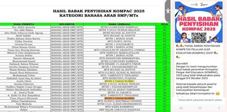 Satui (MTsN 3 Tanbu) – Sebanyak empat orang peserta didik Madrasah Tsanawiyah Negeri (MTsN) 3 Tanah Bumbu berhasil melenggang ke babak final pada ajang Kompetesi Pelajar Alief Education (KOMPAC) 2025 untuk Mata Pelajaran Bahasa Arab.