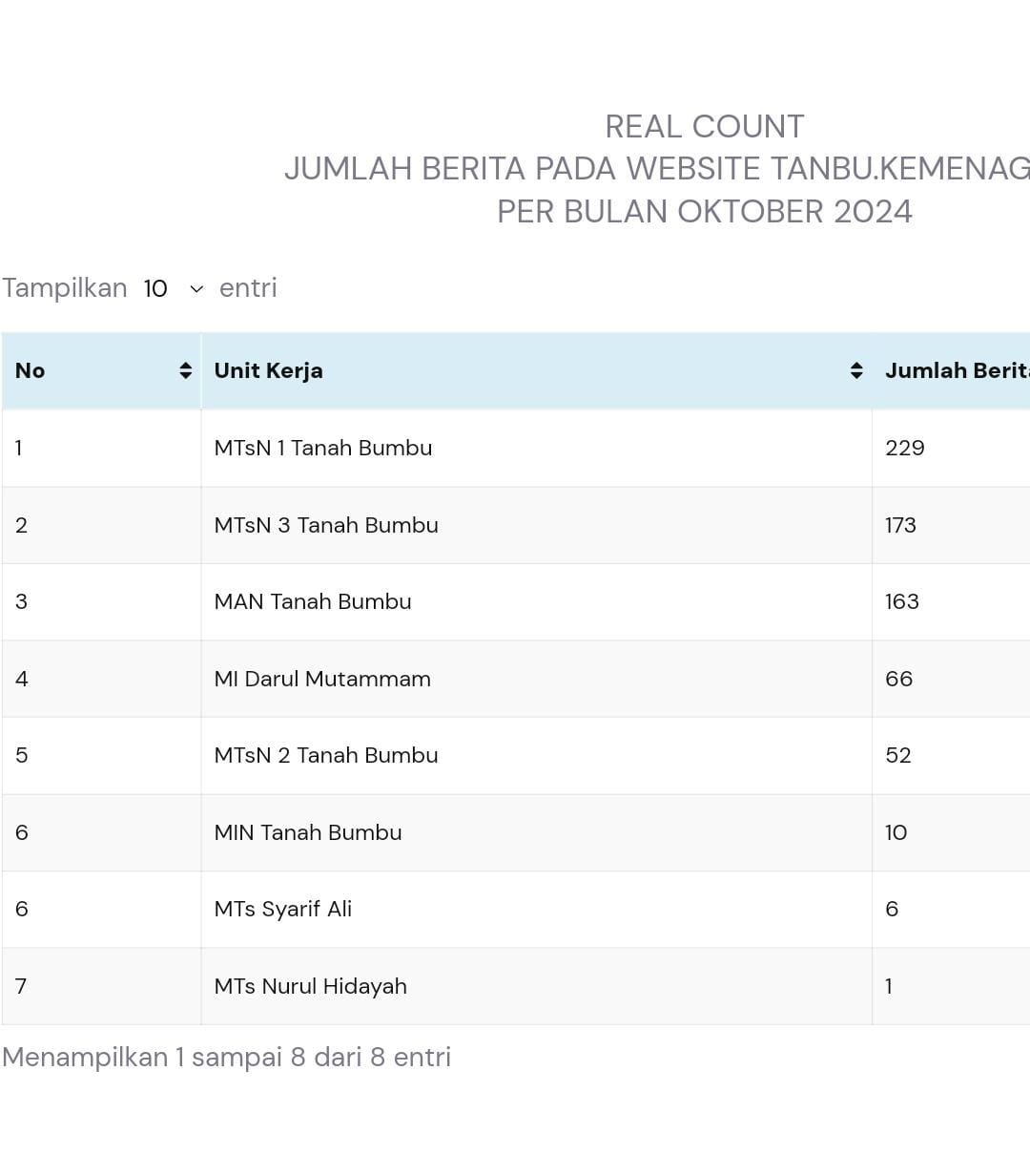 Wakil Kepala Madrasah (Wakamad) Hubungan Masyarakat (Humas) Iliyu Maulidiyah, S.Si mengatakan hasil real count per bualn Oktober yakni sebanyak 229 berita yang sudah dikirim ke email Kemenag Tanbu.