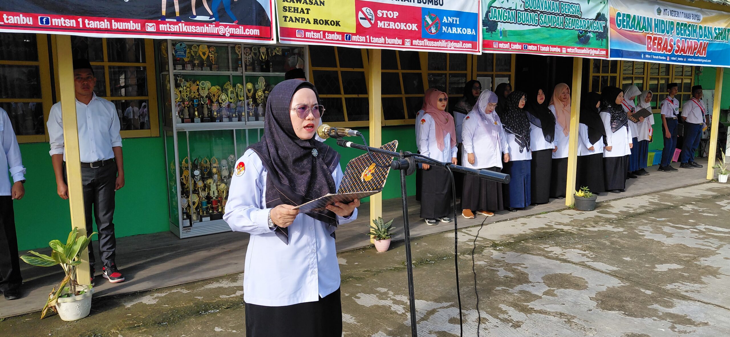 Kusan Hilir (MTsN 1 Tanbu) – Seluruh siswa-siswi Madrasah Tsanawiyah Negeri 1 Tanah Bumbu (MTsN 1 Tanbu) melaksanakan upacara bendera dihalaman madrasah dengan Pembina upacara Maria Ulfah, S.Pd dan petugas upacara kelas IX B, Senin (03/11/25).