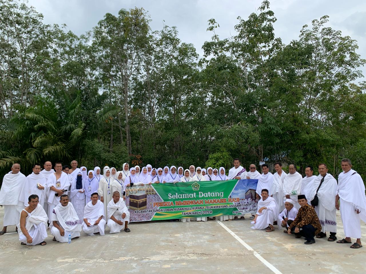 Batulicin (Kemenag Tanbu) – Batulicin (Kemenag Tanbu) – Jemaah Haji di lingkungan Kecamatan Angsana dan sekitarnya menerima materi Bimbingan Manasik Haji pada penutupan Manasik Haji tingkat Kecamatan Angsana dengan mempraktikkan pemakaian Ihram, Tawaf, Sai hingga Lontar Jumrah yang dibimbing oleh Kepala Subbagian Tata Usaha (Kasubbag TU) Kantor Kementerian Agama (Kemenag) Kabupaten Tanah Bumbu H. Khairun Noor, S.Ag, Kamis (24/04/25).