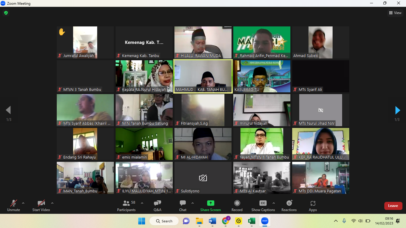 Batulicin (Kemenag Tanbu) – Kementerian Agama (Kemenag) Kabupaten Tanah Bumbu melalui Seksi Pendidikan Madrasah (Penmad) melaksanakan Rapat Koordinasi pengelolaan Simpatika, Pembayaran Tunjangan Profesi Guru (TPG), Tunjangan Kinerja, dan Insentif GBPNS Madrasah Tahun Anggaran 2023 bersama guru madrasah di lingkup Kemenag Tanah Bumbu melalui Zoom Meeting, Selasa (14/02/23).