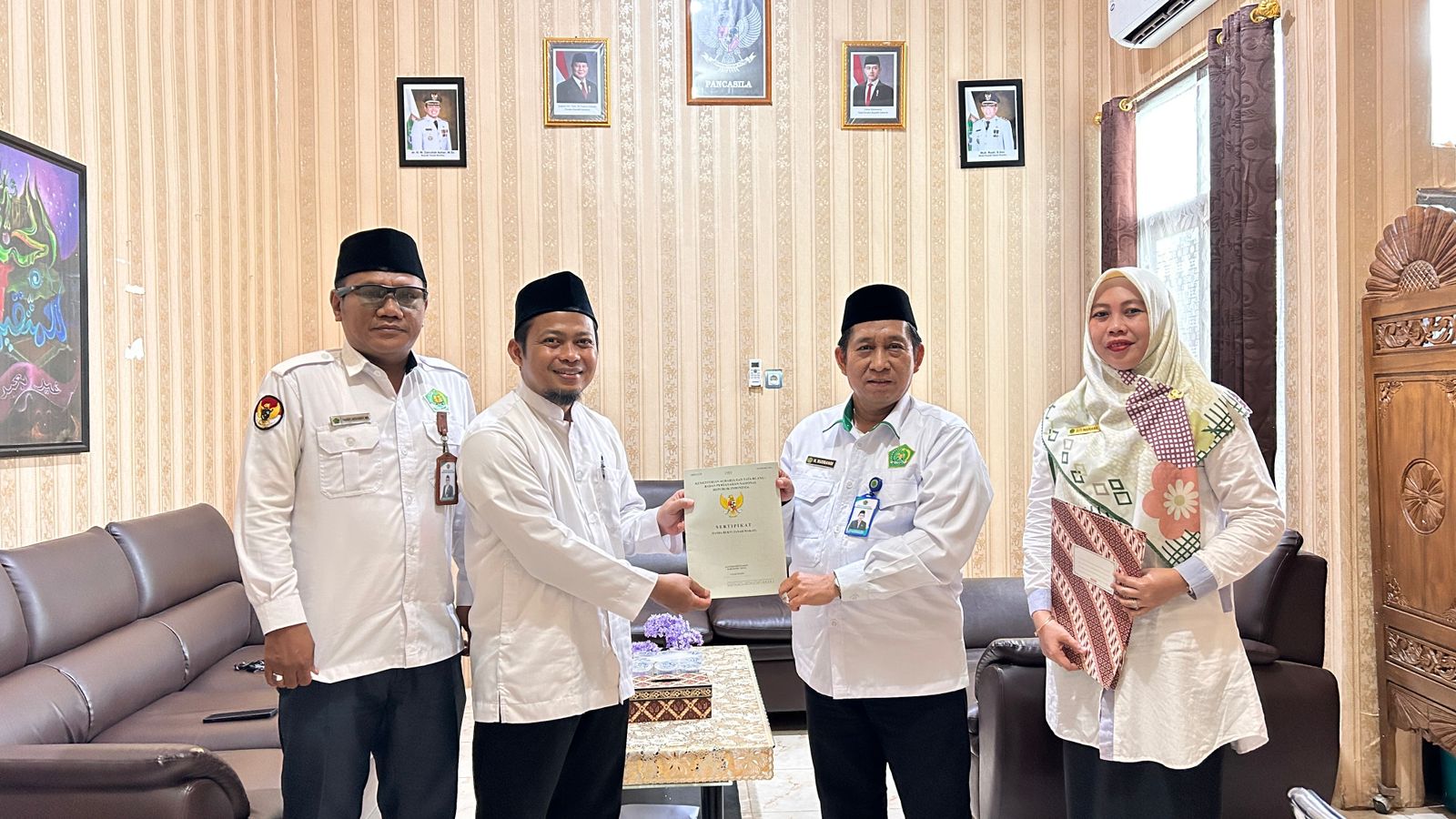 Batulicin (Kemenag Tanbu) – Kepala Kantor Kementerian Agama (Ka.Kankemenag) Kabupaten Tanah Bumbu Drs. H. Rusbandi, MA menyerahkan salinan Sertifikat Tanah Wakaf Pondok Pesantren (Ponpes) Darul Ishlah As Syafi’iyyah kepada Ketua Nazir Ponpes Darul Ishlah didampingi Plt. Penyelenggara Zakat dan Wakaf Fahdiy Arisandiy di ruang Ka.Kankemenag, Selasa (19/11/24).