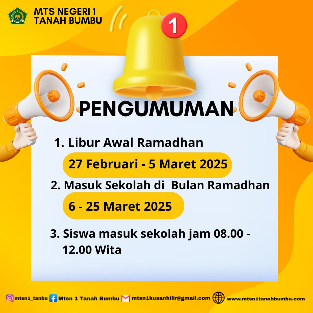 Kusan Hilir (MTsN 1 Tanbu) – Menyambut bulan suci Ramadan, Kepala Madrasah Tsanawiyah Negeri 1 Tanah Bumbu (MTsn 1 Tanbu) Muhaimin, S.Ag mengimbau seluruh siswa untuk memanfaatkan libur awal Ramadan dengan kegiatan positif dan bermanfaat.