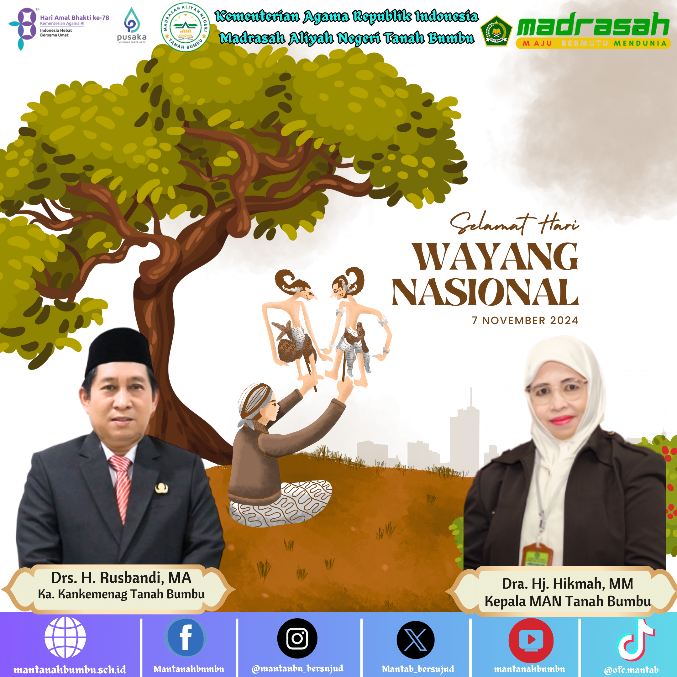Kusan Hilir (MAN Tanbu) — Dalam rangka memperingati Hari Wayang Nasional, Madrasah Aliyah Negeri (MAN) Tanah Bumbu menyampaikan ucapan selamat melalui desain kreatif yang diproduksi oleh tim Humas madrasah. Desain tersebut diposting pada akun media sosial resmi madrasah dan mendapat respons hangat dari warganet, khususnya para pelajar dan pecinta budaya.