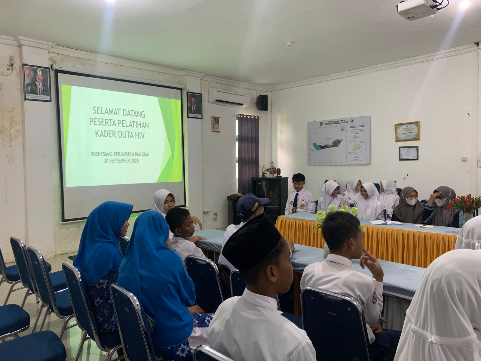 Kusan Hilir (MTsN 1 Tanbu) – Dua siswi Madrasah Tsanawiyah Negeri 1 Tanah Bumbu (MTsN 1 Tanbu) turut serta dalam Pelatihan Kader Duta HIV. Kegiatan ini diselenggarakan oleh Pusat Kesehatan Masyarakat (Puskesmas) Perawatan Pagatan dan bertempat di Aula Puskesmas Pagatan.