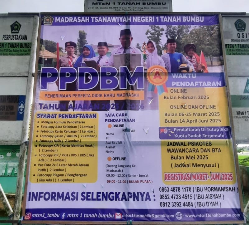 Kusan Hilir (MTsN 1 Tanbu) – Madrasah Tsanawiyah Negeri 1 Tanah Bumbu (MTsN 1 Tanbu) mensosialisasikan Penerimaan Peserta Didik Baru Madrasah (PPDBM) Tahun Pelajaran (TP) 2025/2026 dengan memasang spanduk di depan Gedung madrasah, Selasa (25/02/25).