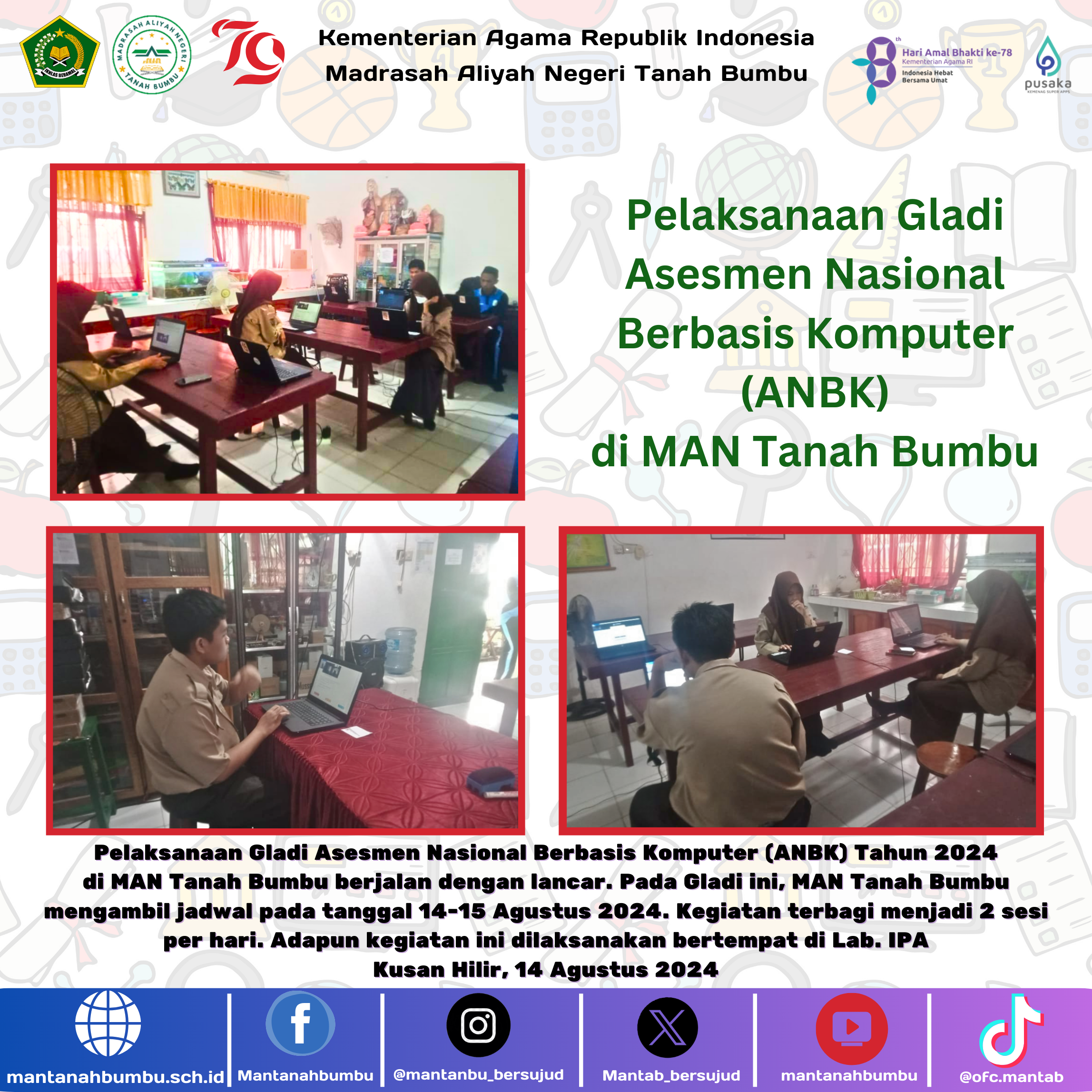 Kusan Hilir (MAN Tanbu) – Pelaksanaan Gladi Asesmen Nasional Berbasis Komputer (ANBK) di MAN Tanah Bumbu berlangsung dengan sukses. Gladi ANBK yang digelar selama dua hari, yaitu pada 14-15 Agustus 2024, berjalan lancar meskipun sempat terkendala pemadaman listrik pada hari kedua, namun pihak madrasah telah mengantisipasi kemungkinan tersebut dengan menyiapkan genset sebagai sumber listrik cadangan.