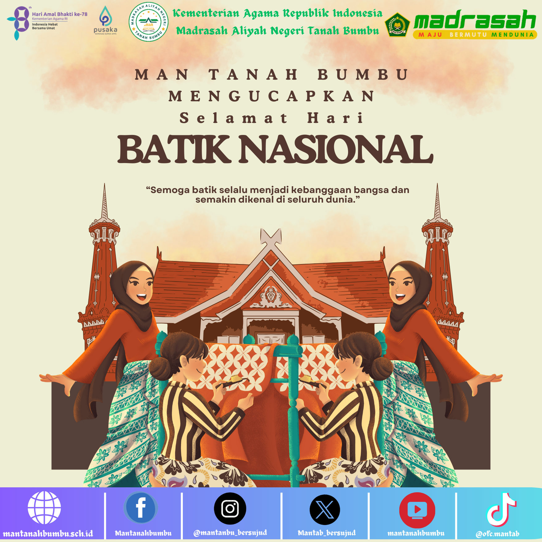 Kusan Hilir (MAN Tanbu) – Kepala Madrasah Aliyah Negeri Tanah Bumbu, Dra. Hj. Hikmah, memperingati Hari Batik Nasional dengan pesan khusus kepada seluruh warga madrasah. Meski tidak ada kegiatan seremonial khusus yang digelar, Kamad menyampaikan harapannya agar batik tetap menjadi warisan budaya yang membanggakan bagi bangsa Indonesia.
