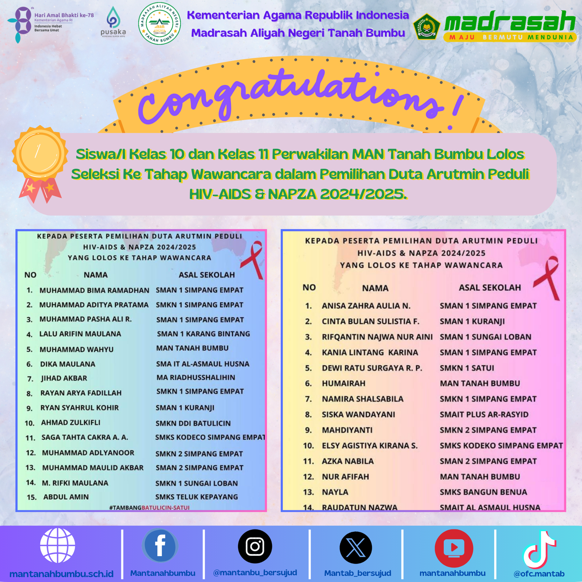 Muhammad Wahyu, salah satu peserta, mengungkapkan rasa syukur atas capaian ini, “Saya merasa terhormat bisa mewakili MAN Tanah Bumbu dalam ajang ini. Kami akan berusaha memberikan yang terbaik saat tes wawancara nanti,” katanya.