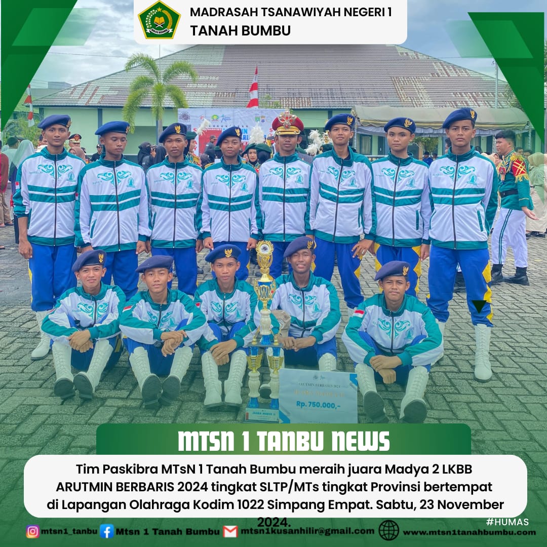Kusan Hilir (MTsN 1 Tanbu) – Tim Pasukan Pengibar Bendera (Paskibra) Madrasah Tsanawiyah Negeri 1 Tanah Bumbu (MTsN 1 Tanbu) kembali menorehkan prestasi membanggakan pada ada ajang Lomba Ketangkasan Baris Berbaris (LKBB) Arutmin 2024 tingkat Provinsi Kalimantan Selatan yang diselenggarakan di Lapangan Olahraga Kodim 1022 Simpang Empat, tim ini berhasil menyabet Juara Madya 2, Sabtu (24/11/24).