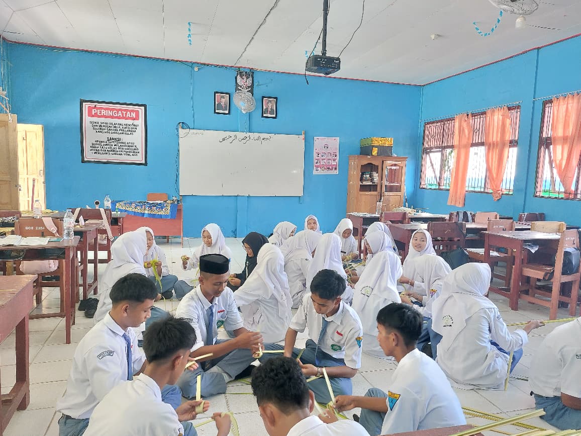 Selama kegiatan berlangsung, suasana kelas terlihat aktif dan penuh antusiasme. Para siswa bekerja sama dalam kelompok untuk menyiapkan bahan janur dan saling membantu menyusun pola ketupat dengan berbagai ukuran dan bentuk. Rifana memfasilitasi proses diskusi kelompok agar siswa mampu mengambil keputusan bersama dengan mempertimbangkan nilai-nilai etika dan tanggung jawab sosial.